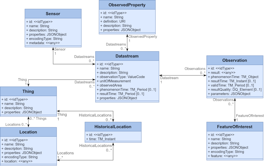 It is time to start populating our database with readings. Before doing that, you should familiarize yourself with the data model defined by the SensorThings API standard. This model consists of the following objects: